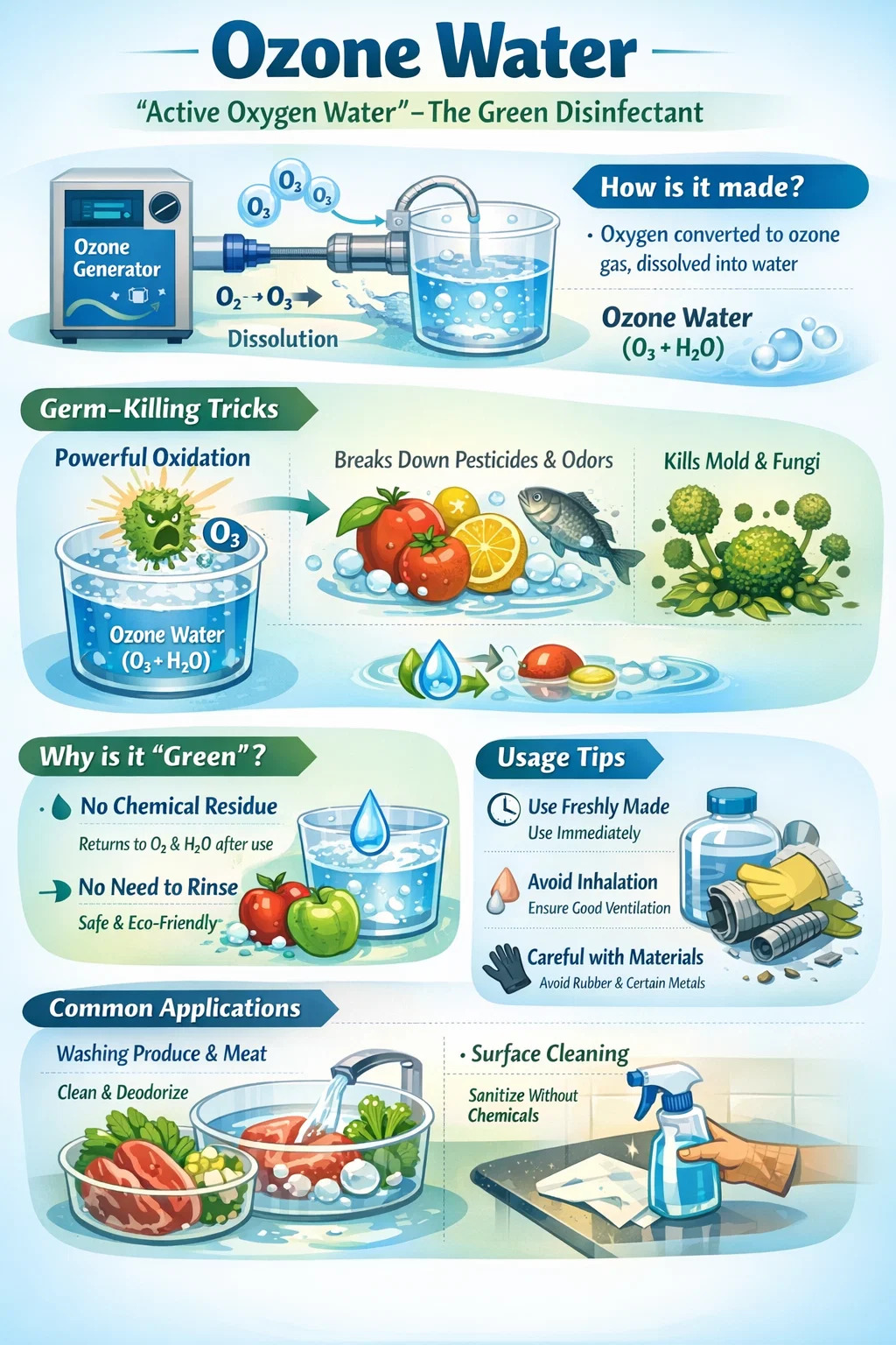 オゾン水 オゾンガスを普通の水に溶かした液体で、強力な洗浄力と消毒力を持った物質です。しばしば比喩的に「活性酸素水」または「緑の消毒剤」と呼ばれます。